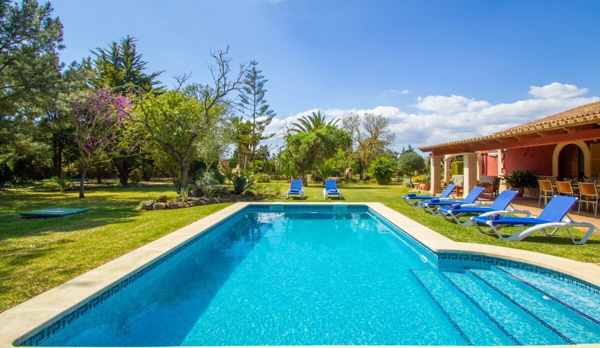 Приватний маєток площею 10 000 м2 із більш ніж 4 000 м2 садів, басейном і дитячим майданчиком дуже близько до найкращих пляжів на острові Майорка. Дуже комфортабельний будинок у середземноморському стилі ідеально підходить для сімей з дітьми з 2 спальнями з подвійними ліжками, 2 ванними кімнатами, 1 ванною кімнатою, великою терасою, міні-кухнею та всіма видами побутової техніки. Кондиціонер, опалення в усіх кімнатах, Wi-Fi, дитяча люлька та дитячий стілець ЗАБЕЗПЕЧУЮТЬСЯ МАКСИМАЛЬНІ ГІГІЄНІЧНІ ТА ДЕЗІНФЕКЦІЙНІ ЗАХОДИ