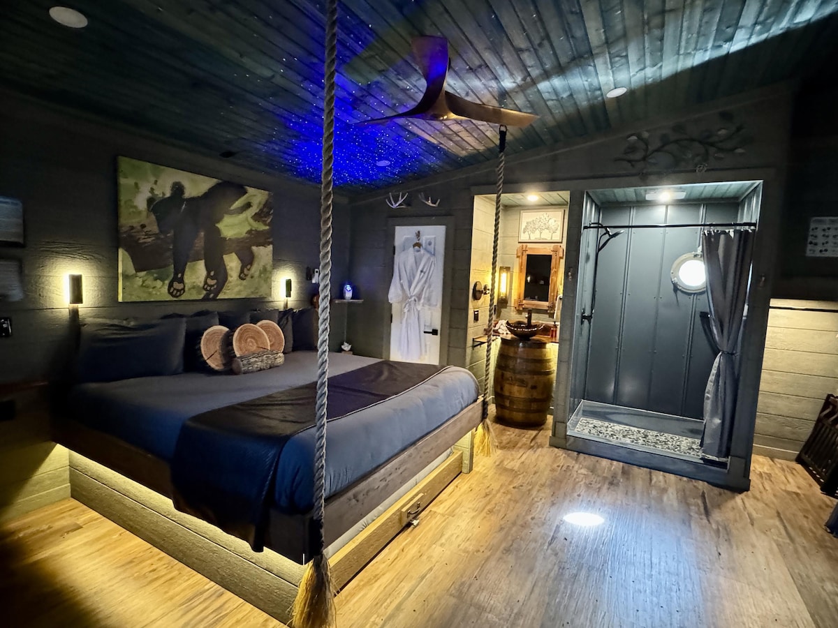 Відокремлена 4-кімнатна/3,5 ванна кімната, 7 акрів з БУДИНКОМ НА ДЕРЕВІ, відкрита кухня, камін, палуба (пандуси для інвалідних візків), гідромасажна ванна, оглядовий майданчик з пропановим каміном та дров 'яний камін у дворі. Зруб Seven Acre Miracle НЕЩОДАВНО ОНОВЛЕНИЙ і знаходиться на одному рівні з відкритою концепцією кухні/вітальні/ігрової зони з басейном, аркадними іграми, аерохокейним столом, кабельним/смарт-телевізором та повністю обладнаною кухнею. Спальня з 4 спальнями має окремий зовнішній вхід і власну ванну кімнату з туалетом.