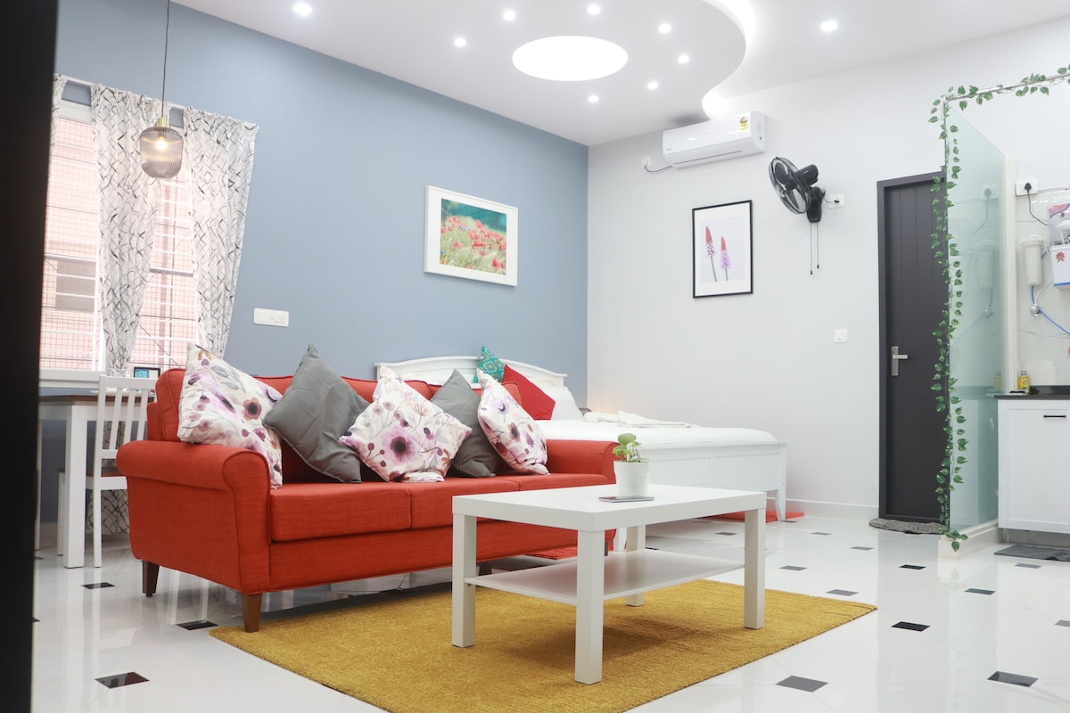 ПОМЕШКАННЯ BLUO - відзначені нагородами помешкання! Приватна студія в центрі міста Корамангала. Ідеально підходить для одиночних гостей і пар - за декілька хвилин їзди від HSR Layout, Indiranagar & Bannerghatta Road. Простора студія без спільного користування з балконом, дизайнерським ліжком, робочим столом, ванною кімнатою та міні-кухнею з варильною поверхнею, холодильником, мікрохвильовою піччю, посудом тощо, а також садом на терасі з сидінням на свіжому повітрі. Щоденна оренда «все включено» - Wi-Fi, Netflix/Prime, прибирання, пральна машина, комунальні послуги, 100% резервне живлення,ліфт.