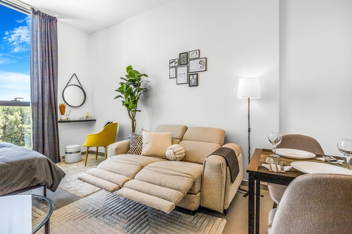 Our luxury studio apartment is located in the heart of Dubai, within walking distance to Dubai Mall, Burj Khalifa, and the famous Dubai Mall fountain. 🌆✨ Damac Upper Crest building offers fantastic amenities: 🚀 High-speed WiFi 🏋️ Fully equipped, spacious gym 🏊 Infinity pool 🧖 Sauna and steam room 🌿 Spacious balcony 🛏️ Hotel-quality linens/towels 🎨 Upscale interior 🍳 Fully equipped kitchen