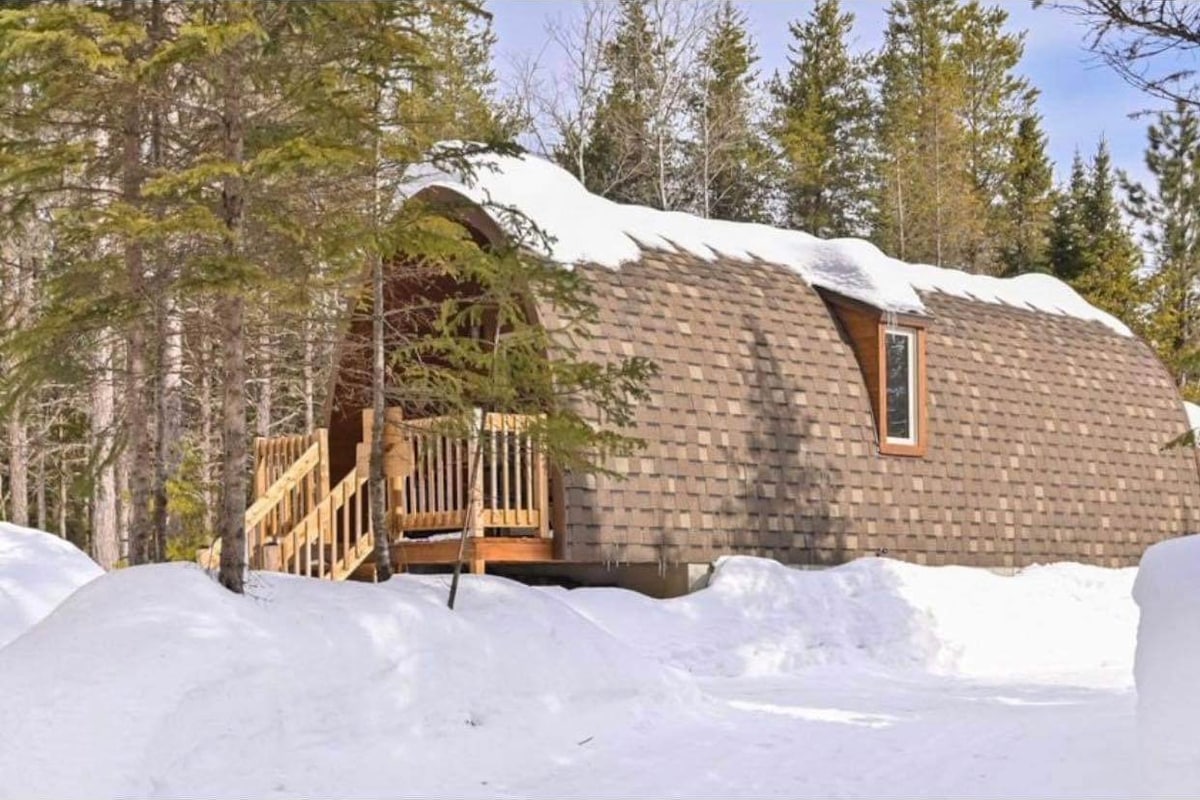Міні-будинок - це наше ідеальне маленьке шале для пари або невеликої сім 'ї. У котеджі є дров 'яний камін на вулиці. Лише 4 шале мають доступ до спа-салону та сауни, одна година на день приватно. Шале розташоване на нашому приватному кемпінгу площею 28 гектарів. Прямий доступ до траси для снігоходів №351. Ми розташовані в центрі Маурісі для активного відпочинку, це ідеальне місце! Не соромтеся звернутися до нас за інформацією.