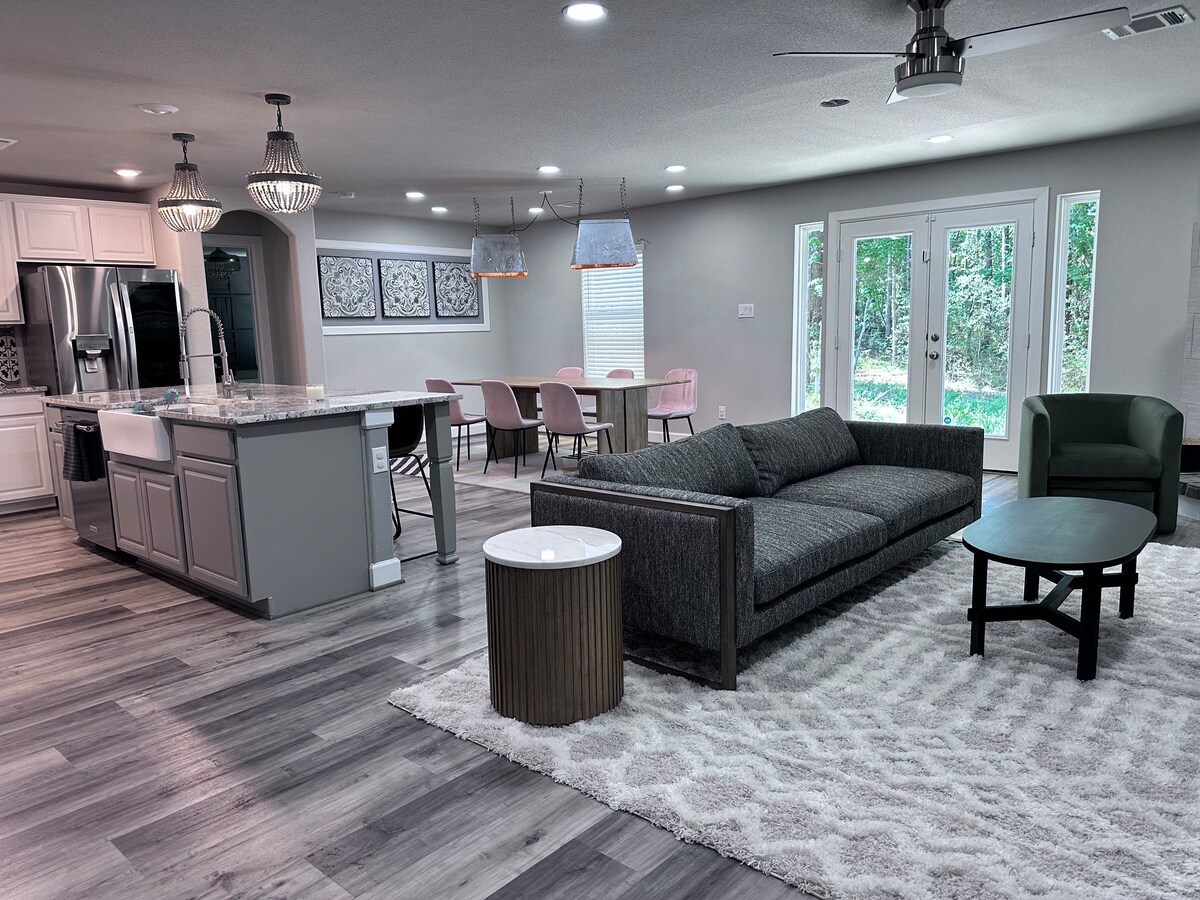Просторий заміський будинок з 3 спальнями та 2 ванними кімнатами на приватній території всього за 45 хвилин від Х’юстона. Дерев’яна підлога, дерев’яні стелі, повністю обладнана кухня та великий критий задній ґанок. Спокійний огороджений задній двір – ідеально підходить для відпочинку або перебування з домашнім улюбленцем. Шарм заміського будиночка з сучасними зручностями, поруч із парком штату та можливостями для відпочинку на природі. Ідеально підходить для сімей, пар або дистанційної роботи. Можна перебувати з домашніми тваринами, і повно техаського шарму!