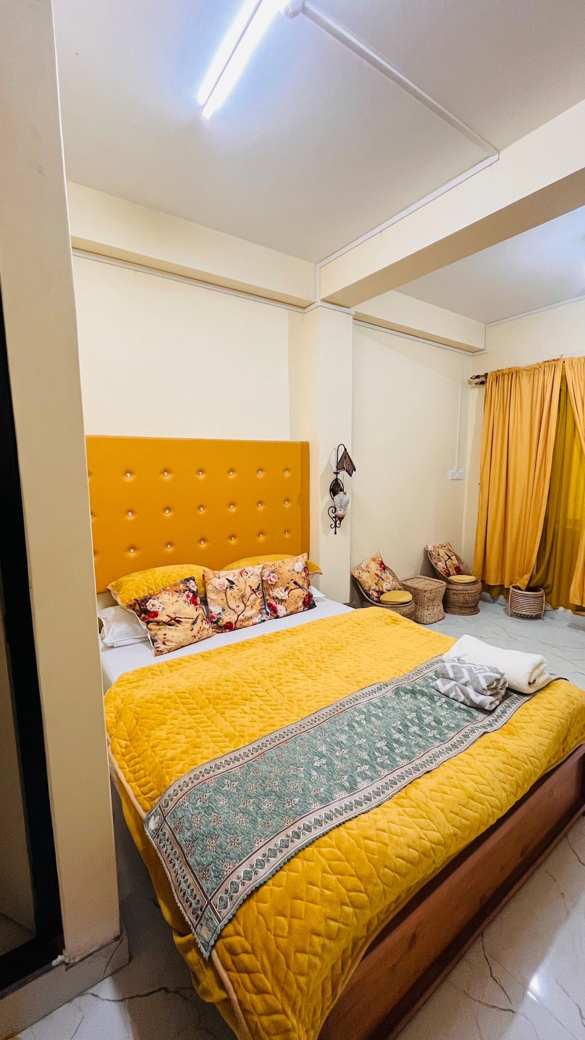 Step into a warm and thoughtfully designed 2BHK retreat in Shillong, styled with soft earthy tones, handcrafted wooden furniture and cozy boho accents. The apartment offers a spacious living room, serene bedrooms with hotel-style bedding and a charming dining nook with a live-edge wooden table. Soft lighting, curated décor and peaceful surroundings make this the perfect space to relax, unwind and feel completely at home. Perfect for couples, families or anyone seeking a peaceful mountain escape.