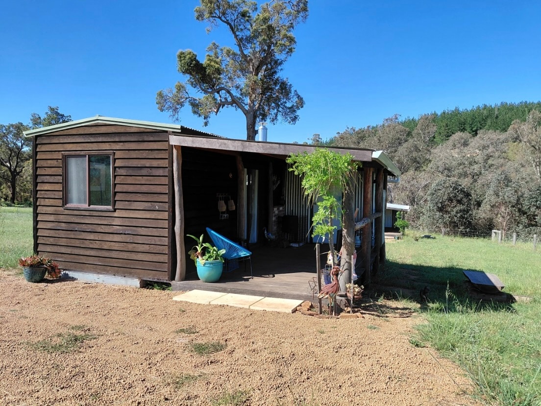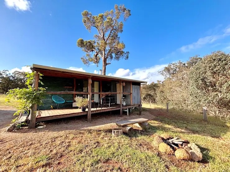 The Blue Wren cabin features a queen bed, single bunk beds, a kitchenette, and a rustic bathroom. Relax on the large veranda overlooking the paddocks and the nearby brook while sipping a hot drink or a glass of wine. Off-grid with solar, rainwater, and septic; Telstra works, others may need a dongle. Explore local flora and fauna, wander to the Blackwood River, visit ducklings and Nigerian dwarf goats, or play on the big oval—a perfect, peaceful city detox surrounded by tranquility and nature.
