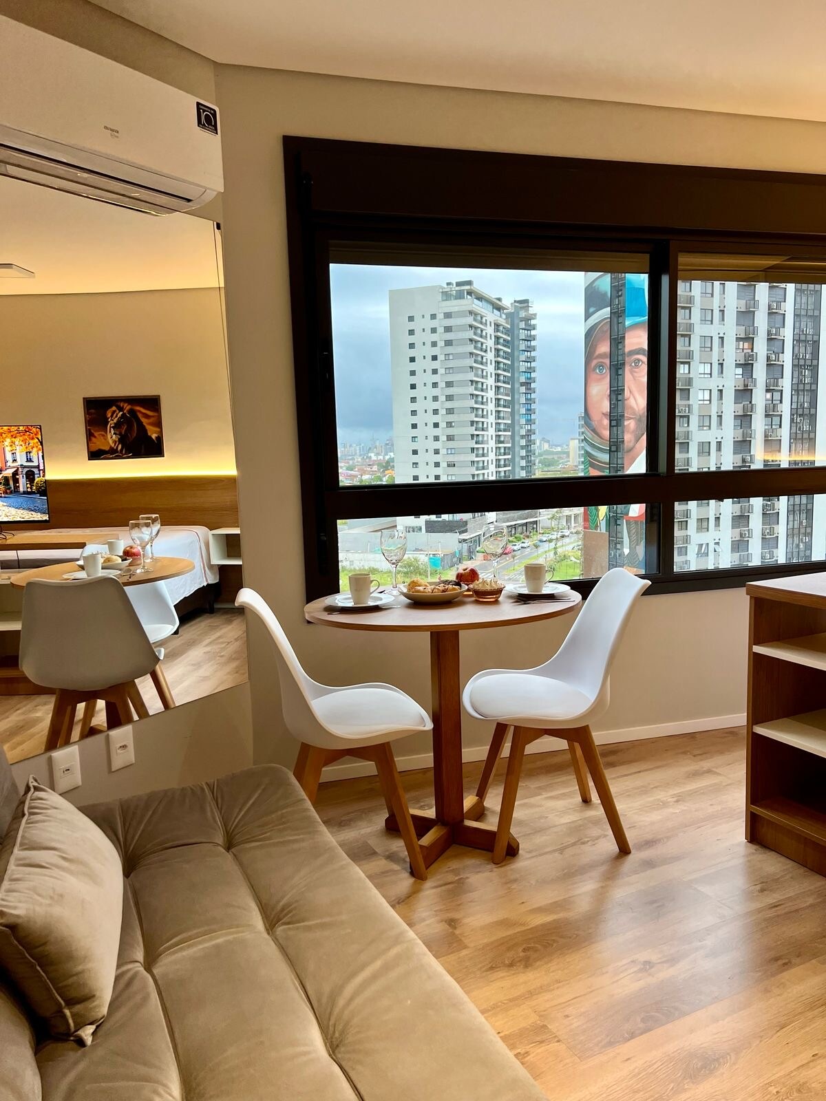 Студія з гаражем в найкращому місці Пелотаса. Гостюйте в будівлі Канто з приголомшливим видом на місто та насолоджуйтеся комфортним перебуванням у вишуканому лофті. Зручності: - Ліжко queen-size - Енксовал високої якості з 2500 дротяними простирадлами - кавоварка Nespresso - Гра для рушників - фен; - Зручності в Баті - Повнорозмірне дзеркало - SmartTV 43" з обертанням на 360° - Wi-Fi. - Кондиціонер Samsung WindFree Hot and Cold - Повна кухня. Стійка реєстрації 24/7