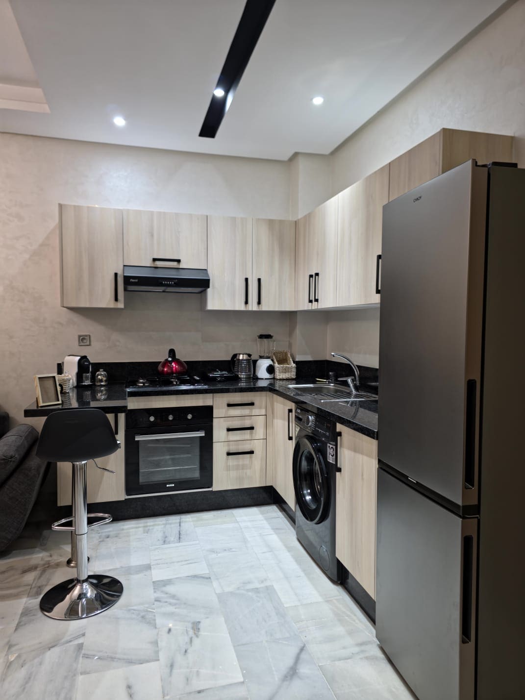 Розкішна студія площею 45 кв. м з терасою + паркуванням у підвалі в Айн Себаа, Касабланка, поруч із залізничним вокзалом Айн Себаа, 1,5 км, розташована в районі Айн Себаа, Касабланка, з усіма сучасними зручностями: спальня з двоспальним ліжком та кондиціонером для відпочинку вночі. Простора, зручна американська вітальня з кондиціонером (режим охолодження або опалення), телевізором з 55-дюймовим екраном, італійським душем з гарячою водою для вашого комфорту та кухнею.