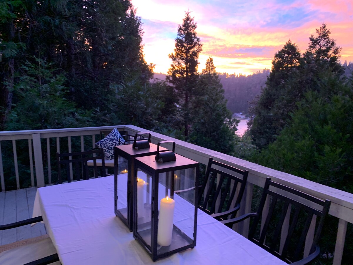 This tranquil, light-filled cabin located in the San Bernardino National forest is surrounded by pine trees, fresh mountain air and gorgeous views. Curl up by the fireplace with a good read or play records from the LP collection. The large back deck has the best view where you can enjoy drinks, meals or sitting by the gas run fireplace. Thrifts stores, family run shops, walk along Lake Gregory, it's all here for your enjoyment.