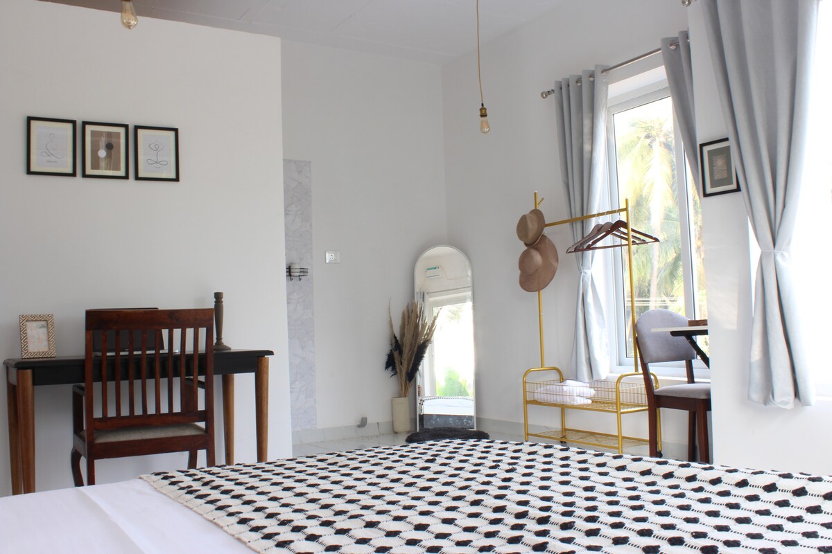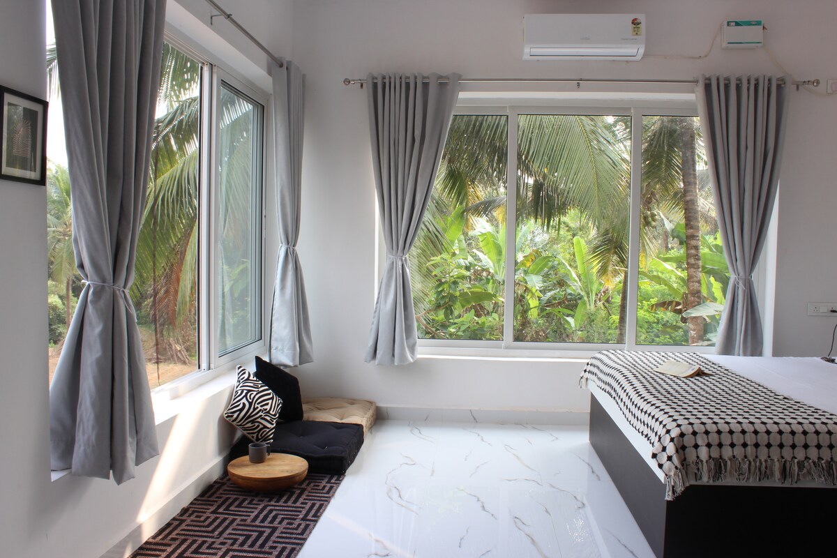 Насолоджуйтеся звуками природи, перебуваючи в цьому унікальному помешканні. Відпочиньте в яскравому, просторому помешканні, оточеному природою. Насолоджуйтеся безтурботними краєвидами на схід сонця, спостерігайте за заходом сонця з балкона та насолоджуйтеся звуками щебетання птахів. Цей сучасний будинок за 5 хвилин їзди від пляжу Мандрем ідеально підходить для пар, віддалених працівників, групи друзів або тих, хто шукає тихий відпочинок з усіма домашніми зручностями Ласкаво просимо до самого першого підрозділу Mogachestays.goa