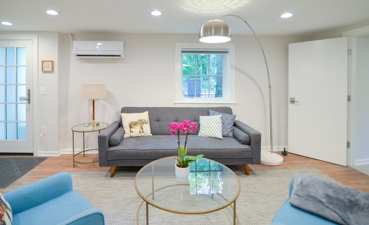 Нещодавно відремонтована, простора та сучасна квартира на рівні саду 1 BR/1 BA у найкращому кварталі в Адамс-Морган. Ідеально підходить для сімей, одиночних або ділових мандрівників. Наша квартира розташована на краю парку Рок-Крік в історичному районі Калорама-Трайангл, у тихому притулку від центру Адамса Моргана, а також в декількох хвилинах ходьби від Dupont Circle, метро Woodley Park, U Street тощо. Повністю обладнана кухня з новою технікою, телевізором з Netflix і усім необхідним для швидкого візиту або тривалого перебування.
