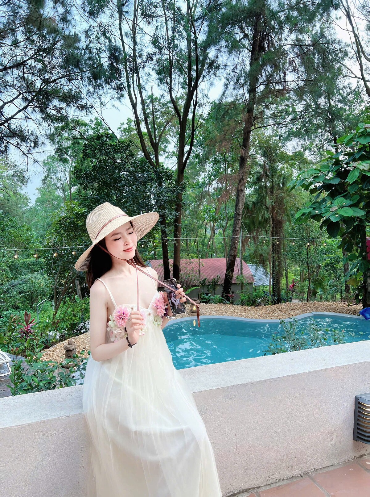 Rest and relax in the peaceful, poetic space of LIME House on the shore of Phu Nghia Lake, Soc Son, Hanoi. A duplex wooden house with large glass panels filled with light, hidden in a garden filled with chirping birds. In front of the house is a small wooden swimming pool, connected to a large porch, a dining table, a BBQ kitchen under a purple flower trellis. A long green lawn, next to a row of dark pine trees. 20 minutes from airport 60 minutes to Center Hanoi City.