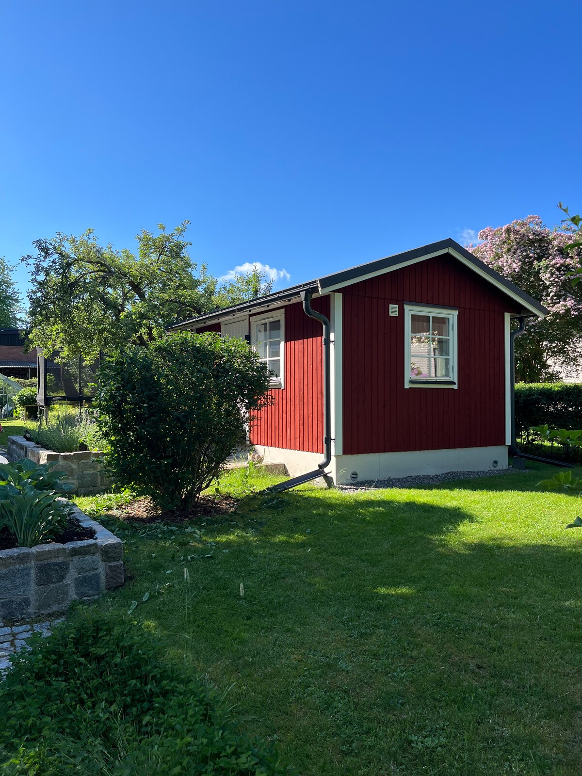 Ласкаво просимо до нашого гостьового будинку, розташованого в нашому саду. Є двоспальне ліжко, диван-ліжко, обідня зона, міні-кухня, холодильник/морозильна камера, мікрохвильова піч, туалет, душ та пральна машина. Підходить для дітей з батутом, ігровим будиночком, гойдалками. Ми живемо в 2 хвилинах від приміської залізничної станції Häggvik з прямими поїздами до Арланди, торгового центру Mall of Scandinavia, Strawberry Arena та Стокгольма. Пішки до кількох продуктових магазинів, ресторанів та аптек. 10 хвилин пішки до природного заповідника Järvafältets та оглядової ферми з вівцями, свинями, коровами, козами, курчатами та конями