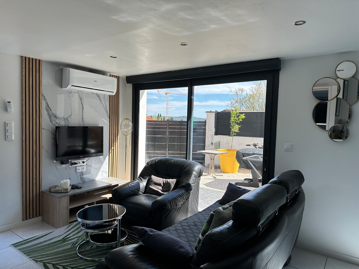 Яскравий і зручний дуплекс із красивою тропецькою терасою, не виходячи з видом, на 3-му та верхньому поверхах. У центрі провансальського селища, недалеко від магазинів , ресторанів та типового ринку. 15 хвилин від пляжів. Багато можливостей для піших прогулянок і місць для скелелазіння доступні для вас, ви також можете відкрити для себе класифіковане селище Ле-Кастеллет або для любителів автоспорту Кастеллет. Безкоштовна громадська парковка за 200 м.