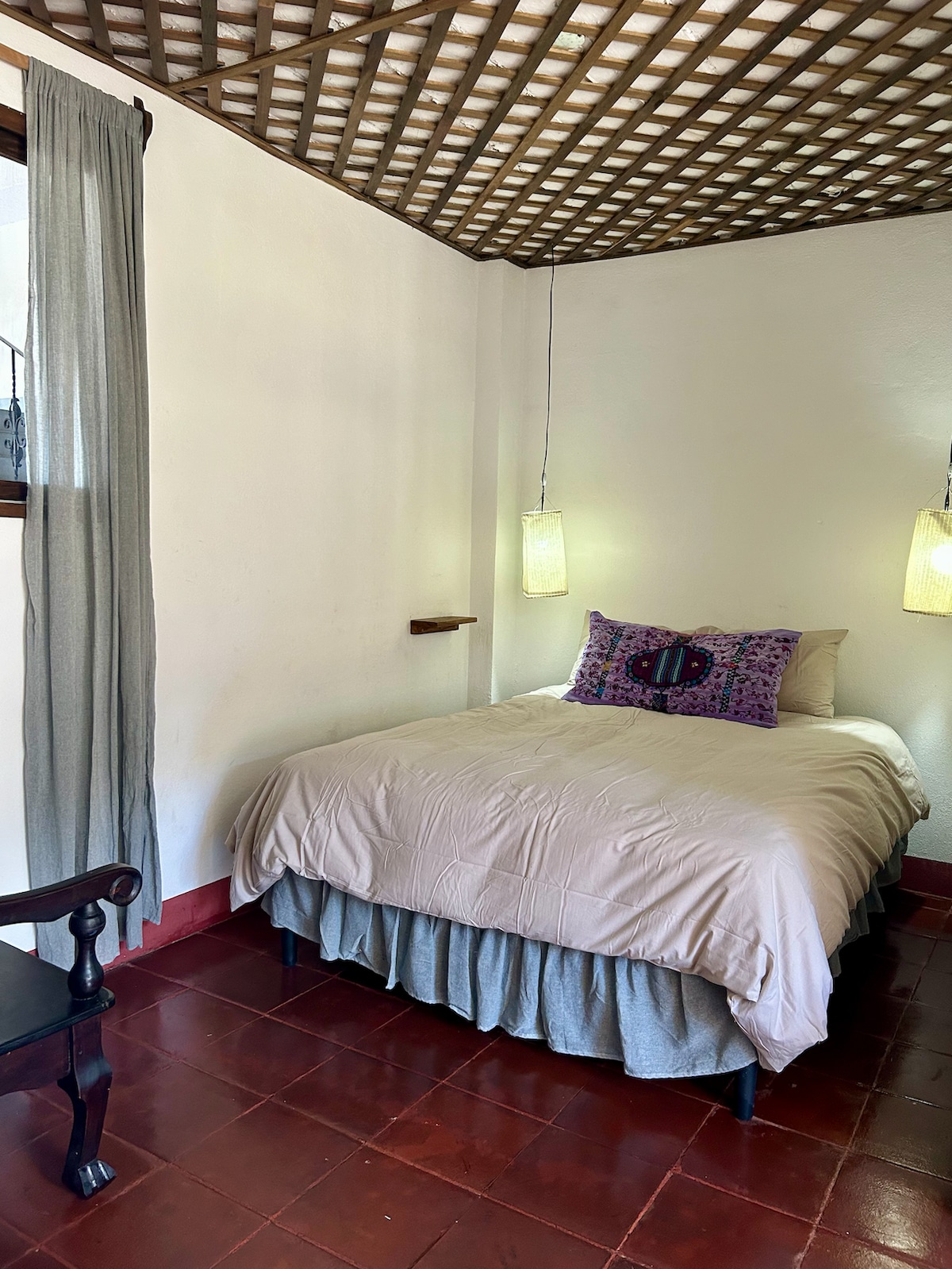 Відпочиньте в нашій затишній, висококласної ванній кімнаті з ліжком розміру King size ручної роботи. Вийдіть на приголомшливий краєвид на озеро Атітлан, пишні сади та величні гори, які створюють спокійний притулок для максимальної релаксації. Насолоджуйтеся їжею на спільній кухні на відкритому повітрі прямо перед кімнатою, що пропонує ідеальне місце для насолоди захоплюючими пейзажами. Завдяки приватному доступу до спокійного басейну, спа-салону та мальовничої садовій доріжці до причалу озера ваше перебування буде справді незабутнім.