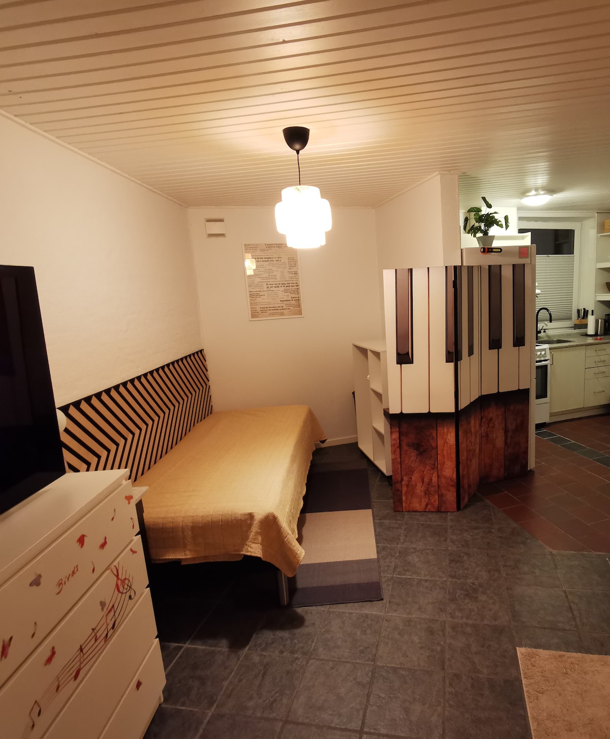 Hyggelig kælderlejlighed med soveværelse og opholdsstue med sovesofa, lille køkken med køleskab og lille fryser, airfryer og 1 kogeplader, elkedel og microbølgeovn. Spiseplads til 4 personer Fint badeværelse med bruser. 3 min kørsel til Gråsten slot, 12 min til Sønderborg. Efter et par minutters gang er man på en lille hyggelig strand og fra parkeringspladsen ved huset er der udsigt over Nybøl Nor