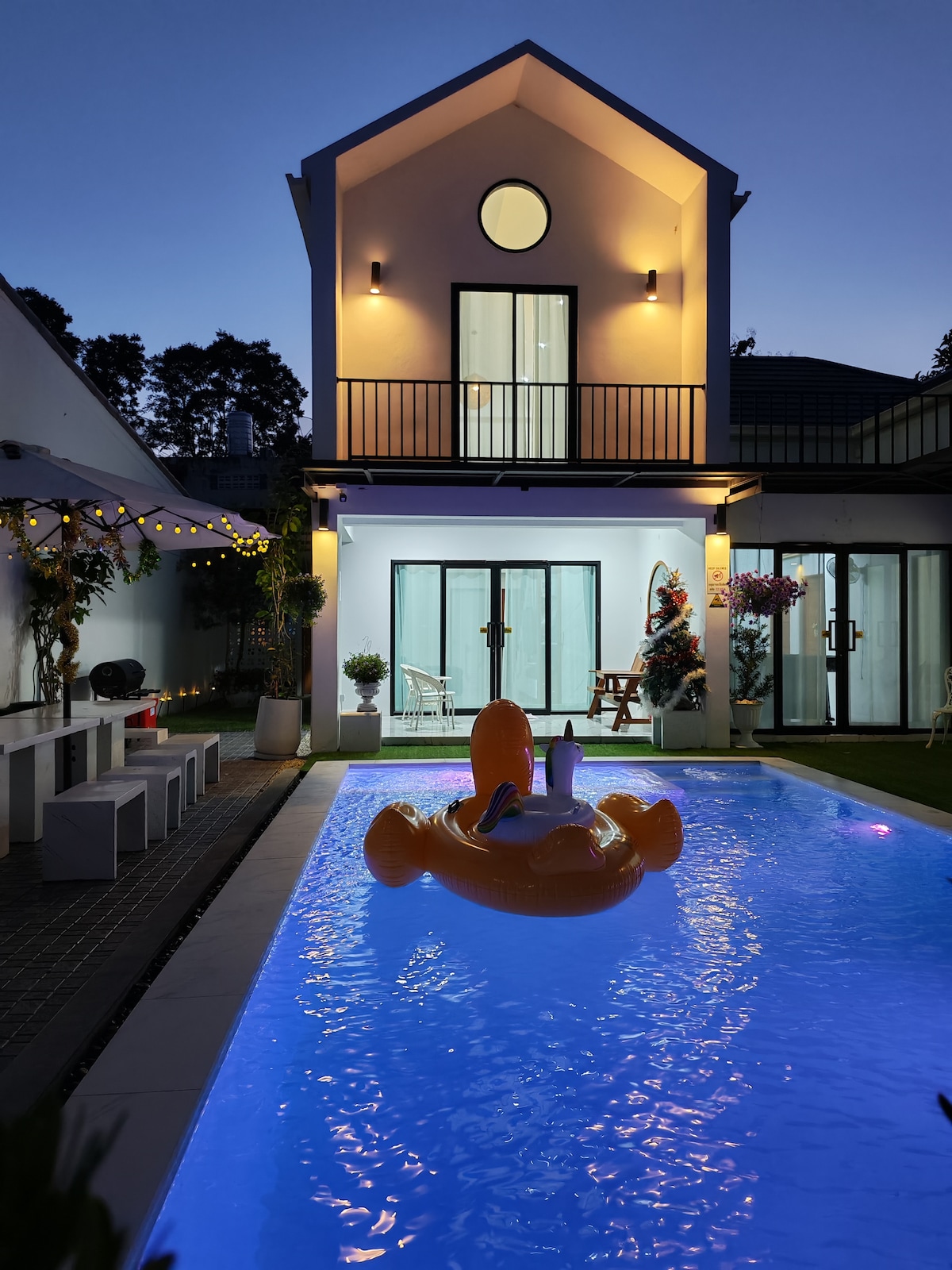 Нова вілла з приватним басейном у саду має 2 спальні, 2 ванні кімнати для 4 осіб (можна додати додаткову подушку для 2 дорослих або 4 дітей 300 батів)./особа) + безкоштовний невеликий сніданок із великою вітальнею, приватним басейном зі спільним басейном, окремим дитячим басейном, фітнес для дорослих, розташований посеред красивого саду, можна додати додаткові подушки, можна на грилі, є гриль на вугіллі, всередині помешкання є кафе, служба харчування - напої, послуги сніданку (кухня з галаном), можна скористатися їжею та транспортом Grab, можна замовити сніданок.