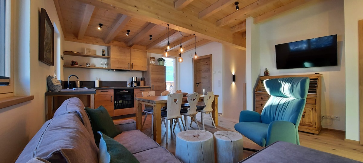 Ласкаво прошу до пентхаусу GIPFEL-GLÜCK. Вершина резиденції Sunleitn: 107 м² (1 153 кв. фути) із вітальнею/їдальнею відкритого планування та приголомшливою оранжереєю зі скляним дахом. Повністю обладнана кухня та доступ до просторої тераси з панорамним видом на гори на 180° в повній приватності. Відпочиньте в приватній фінській сауні з відновленої деревини, звідки відкривається краєвид на гори. 2 спальні, ідеально підходить для 4 гостей.