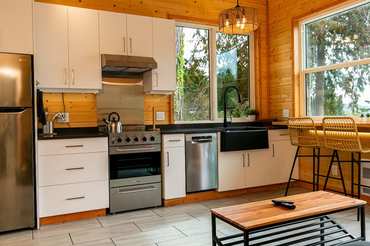 Сучасне західне узбережжя надихнуло відпочинок, розташований серед дерев, під великим небом та біля океану. Цей люкс може похвалитися двома спальнями та зручним диваном-ліжком розміру Queen size. Повністю обладнана кухня з усім необхідним, щоб створити смачні та солодкі. Пральня в номері. Повна ванна кімната з підігрівом підлоги. Душ на відкритому повітрі та сауна також чекають на вас. Розслабтеся, сидячи біля місця для пікніка та багаття. Насолоджуйтеся місцевим кафе та багатьма прекрасними пляжами вздовж цього узбережжя!