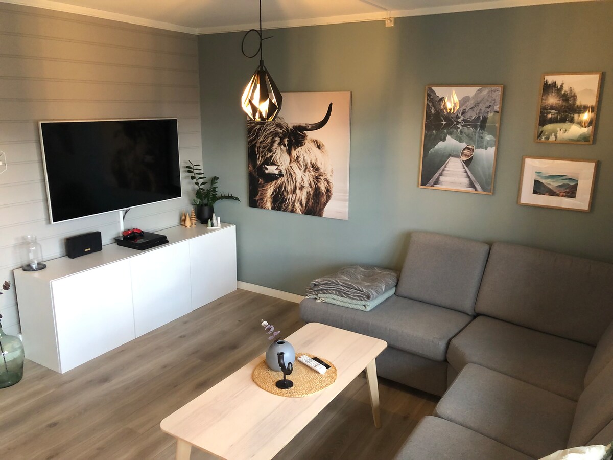 Яскравий і сучасний котедж недалеко від моря. Великі панорамні вікна з фантастичним видом. Кухня з посудомийною машиною. Поставляється з невеликим рибальським човном/гребним човном. Ви можете порибалити або поплавати безпосередньо під зрубом. Гідромасажна ванна на дровах (використовуйте обов 'язково, 350 норвезьких крон за 1 використання,потім 200 за опалення), лоток для сапсерфінгу здається в оренду 200 норвезьких крон за перебування на сапсерфі Зруб розташований самостійно на носі в кінці річки в фьорді. Прибуття зазвичай з 15:00,але часто можна заселитися раніше. За 20 хвилин їзди від альпійського центру Sæterlia і перехресних стежок