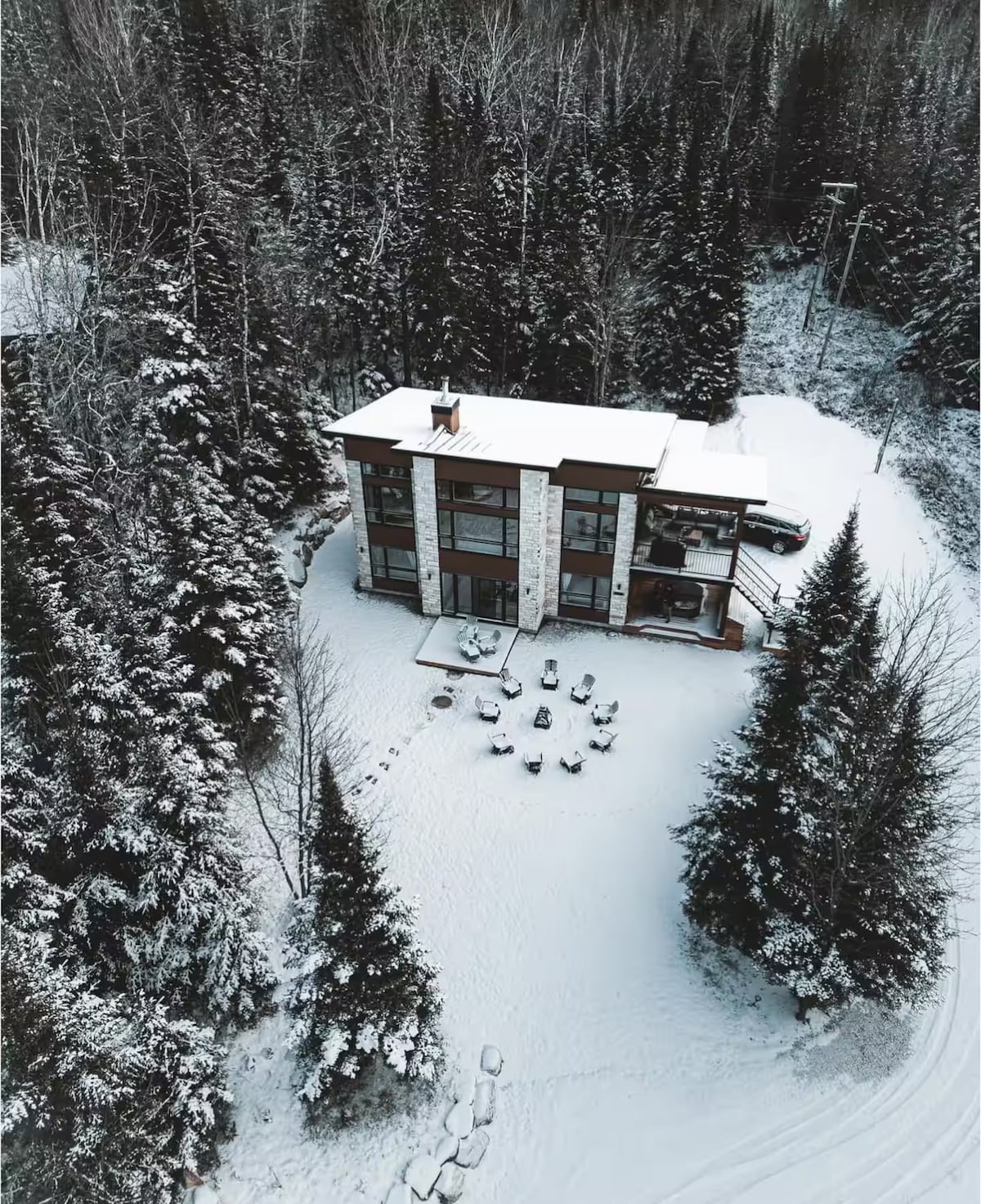 Наше скандинавське лісове шале ідеально підходить для проведення часу в парі (або з дитиною) або для роботи (з високошвидкісним Wi-Fi). Дерев 'яний інтер' єр теплий і затишний. З повноцінних вікон відкривається приголомшливий вид на лісову долину. Кухня відкритого типу та вітальня тримають вас у розмові під час приготування їжі. Якщо ви віддаєте перевагу готувати на вулиці, є місце для багаття з грилем і обіднім столом на відкритому повітрі. Всього в 70 хвилинах їзди від Монреаля. Озеро знаходиться в 25 хвилинах ходьби, якщо припаркуватися неподалік.