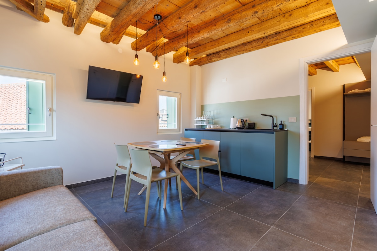 Характерна квартира в історичному центрі Кіоджії, зручна для всіх зручностей, мансардні кімнати, сучасні та функціональні, повітряні та дуже яскраві, обладнані всіма зручностями .Wi-Fi,кондиціонер ,дуже близько до стоянки. Чудова база для екскурсій до Венеції , венеціанських вілл, природних парків Падуя і По дельта. Можливість подорожей човнами. Обладнаний велосипедами, щоб дістатися до сусіднього пляжу. Ідеально підходить для пар , сімей, ділових поїздок, обладнаний усім необхідним