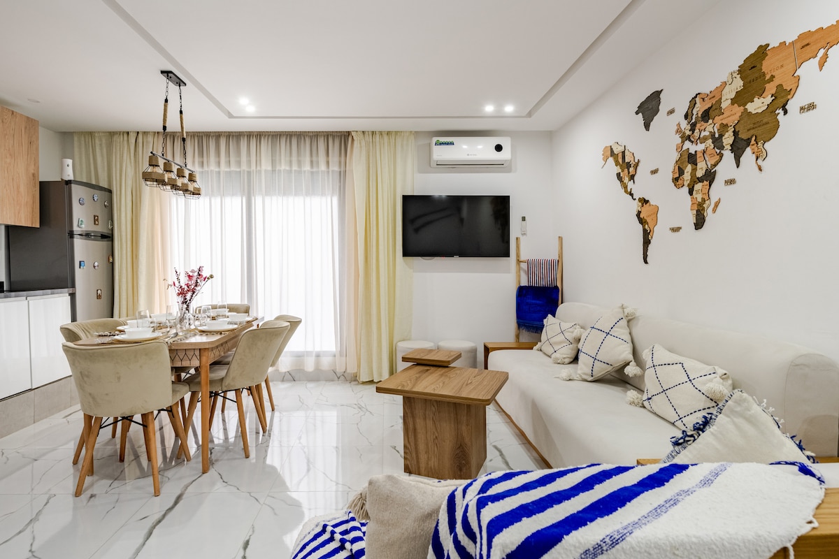 Квартира мрії з видом на море та басейном у Кабо-Негро, Марокко. Головний люкс, дитяча кімната, обладнана кухня, світла вітальня з підключеним телевізором, їдальня на 8 осіб. Резиденція з 2 великими басейнами Toboggan, міні-футбольними полями, Pé, дитячим майданчиком. Швидкий доступ до пляжу, ресторанів, магазинів, аквапарку, квадроциклу, коня, поля для гольфу. Доступна служба паркування та доставки (Glovo). Ідеально підходить для сімейного відпочинку. Басейн уважно не працює взимку з 1/10 до 15/5