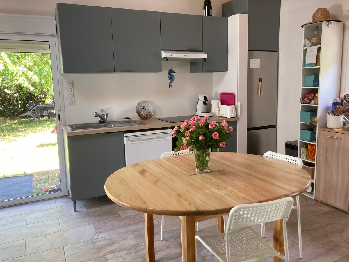Відремонтоване сімейне помешкання з великою вітальнею та повністю обладнаною відкритою кухнею, 3 спальнями та 1 ванною кімнатою нагорі, 1 спальнею та 1 ванною кімнатою внизу, іграми та іграшками, а також закритим садом. Тихо і близько до Lidl, села та озера Сустон і його розваг (теніс, паддл-тенніс, лазання по деревах, морський центр, медіатека), 8 км від океанського пляжу та морського озера (через велосипедну доріжку або безкоштовний автобус). Підходить для 8 або навіть 10 осіб (4 спальні + диван-ліжко + дитяче ліжечко + дитяче ліжечко).