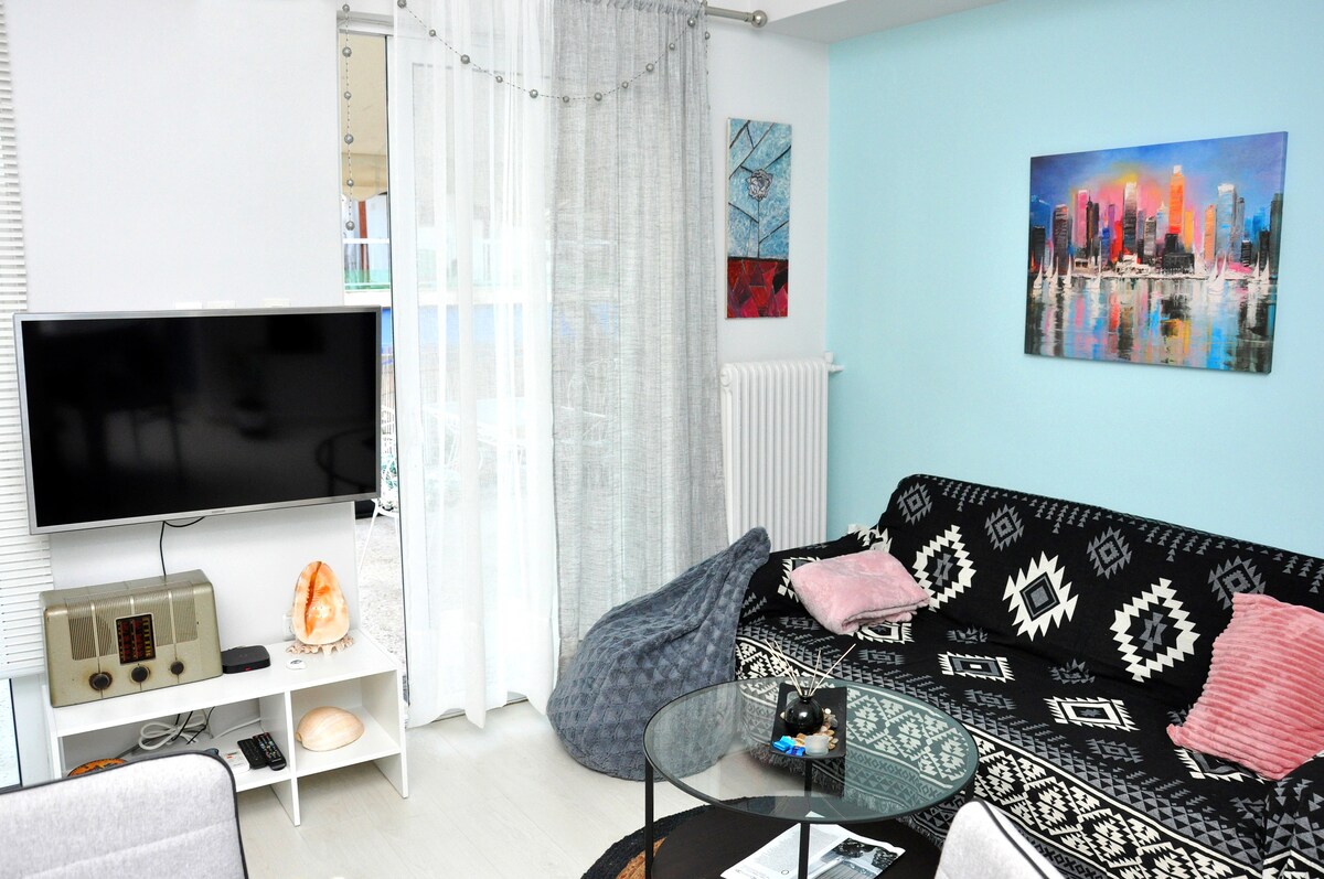 Затишна квартира на першому поверсі площею 47 кв. м з видом на патіо, розташована в Палео-Фаліро, поруч з морським узбережжям та автобусно-трамвайною станцією. У елегантному районі уздовж морського узбережжя з парками, пристанями, пляжами, барами та ресторанами. Супермаркети, продуктовий магазин, м 'ясорубка знаходяться на відстані 100 м. Ідеальне розташування, оскільки воно дуже близько як до центру міста, так і до порту Пірей (30 хвилин від обох). Це тихе, безпечне і розслаблене місце, де можна насолодитися морським узбережжям, перебуваючи неподалік від історичного центру міста.