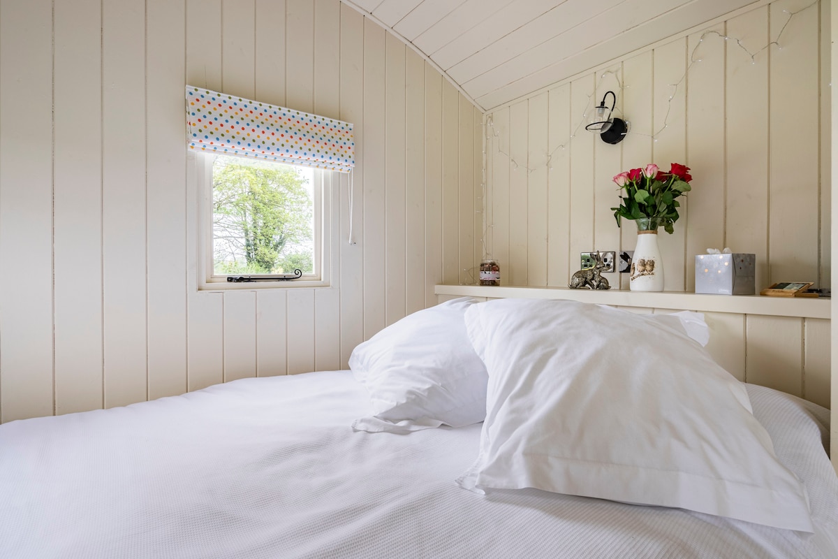Вам сподобається цей романтичний відпочинок у розкішному пастушому фургончику. З затишною дров 'яною піччю та підігрівом підлоги, коли вам потрібен додатковий затишок, ліжко розміру «king size», кухня та подвійний душ у тропічному лісі. Крім того, у нас є вибір настільних ігор. На вулиці є власна гідромасажна ванна на дровах і барбекю з видом на сільську місцевість, а вночі ви можете дивитися на зірки на своєму ліжку, що також робить чудове шезлонг протягом дня!