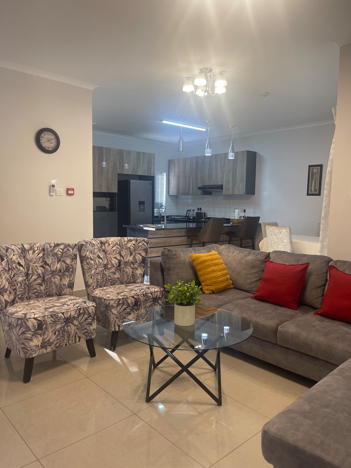 Сучасний затишний будинок із швидким доступом до великого торгового центру в Габороне. Квартира ідеально підходить для бізнес-мандрівників і невеликих сімей, з швидким Wi-Fi, спеціальним робочим місцем і кількома повсякденними зручностями. Основні особливості: • Цілодобова охорона • Швидкий і надійний Wi-Fi • Самостійне прибуття з входом без ключа • Повністю обладнана кухня. • Дві затишні спальні зі світлонепроникними шторами