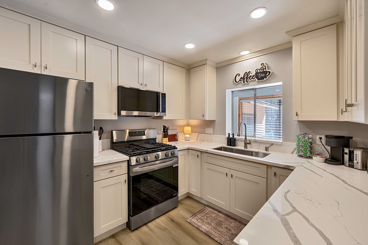 Тихий гірський прихисток, призначений для двох осіб. Насолоджуйтеся окремими апартаментами. Усередині відпочиньте спокій біля вогнища або на ліжку розміру queen size, їжте та готуйте їжу на повністю функціональній міні-кухні, працюйте дистанційно, використовуючи високошвидкісний доступ до Інтернету або дивіться улюблені фільми на смарт-телевізорі. На вулиці можна дістатися пішки, катання на гірських велосипедах, катання на лижах і снігоступах прямо за дверима. Катання на лижах і пляжі Тахо знаходяться в декількох хвилинах ходьби.