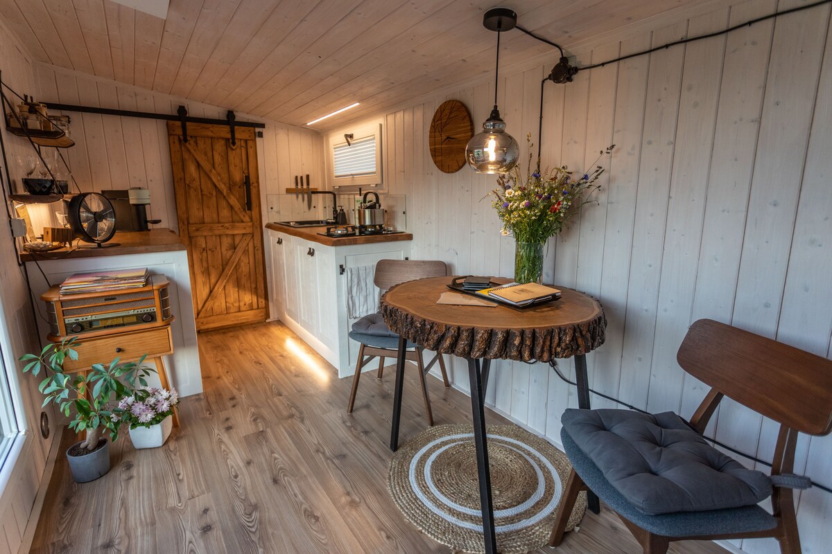 Ми побудували наш міні-будинок «Під горіхами» так, щоб забезпечити максимальний рівень приватності та спокою. Він стоїть поруч із загоном для овець і має чудовий вид на ліси та луки. Будинок невеликий, але продумано облаштований. Він розташований на огородженій території, щоб ваші чотирилапі улюбленці могли приїхати з вами. На території також є приватна фінська сауна на дровах із романтичним краєвидом, якою можна користуватися без обмежень. Усередині ви знайдете зручне ліжко, повноцінну ванну кімнату та кухонний куточок.
