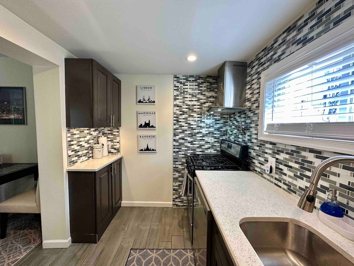 Красивий сучасний будинок із 2 спальнями в тихому блоці, який нещодавно відремонтований для дуже комфортного перебування. Netflix, Amazon Prime, Alexa, Bluetooth-динамік, вхід без ключа та офіс із принтером. Заднє патіо/пергола та сад - чудове місце, щоб випити кави вранці або випити ввечері. Зручні, затишні спальні з розкішними матрацами з пінопластом, м 'якими простирадлами та затемненими відтінками. Кафе, бар і ресторан в кварталі.