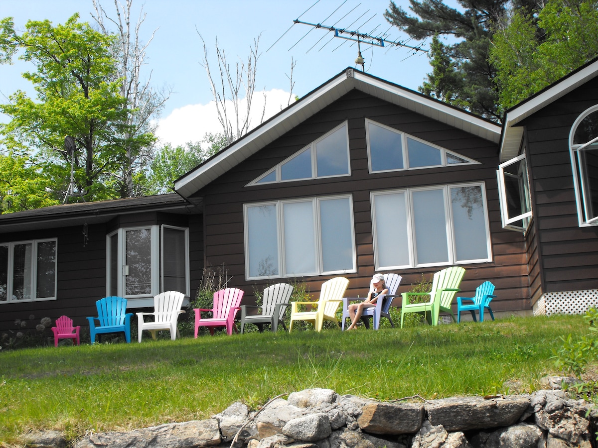 Тихий, затишний, повністю ізольований класичний котедж на березі з критою терасою та 2 причалами на тихій, незайманій системі озер-близнюків (озера Грасс, Лун) недалеко від Гантсвілла в Кірні, Онтаріо. Ми обслуговуємо пари та самотні сім 'ї, яким потрібно відпочити, відпочити, відновити сили або просто відпочити! Повністю обладнаний, з нещодавно відремонтованою ванною кімнатою. Високошвидкісний Wi-Fi (Starlink), Netflix, Crave, Bell Fibe тощо., барбекю, кавоварка, мікрохвильова піч, місце для багаття, дрова. Усе необхідне! Вітаємо походів.