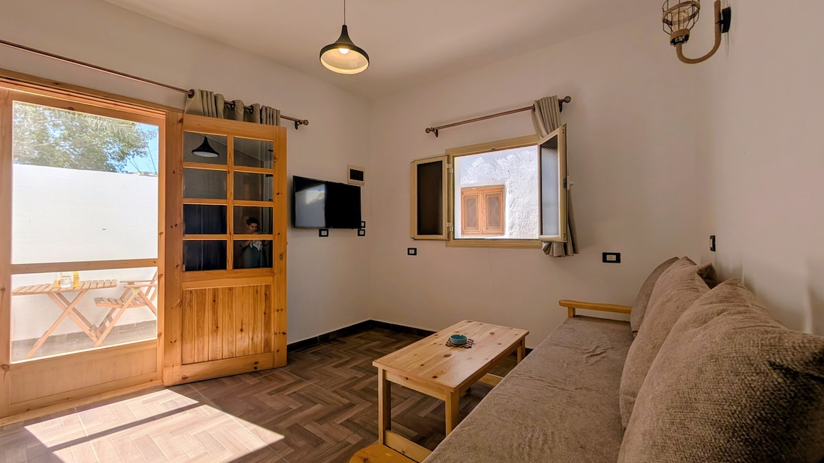 Ласкаво просимо до вашого затишного помешкання в Дахабі! Квартира «Море» розташована на першому поверсі, з неї відкривається прекрасний вид на море крізь пальмові гілки та сонячні промені, як на фотографії. Ця простора квартира з 1 спальнею наповнена меблями та аксесуарами ручної роботи, які відображають органічний і природний спосіб життя, який ми любимо в Дахабі. Розташований на другій лінії безпосередньо біля пляжу, він знаходиться всього в 3 хвилинах ходьби від ринку Ассала та в 10 хвилинах ходьби від маяка.