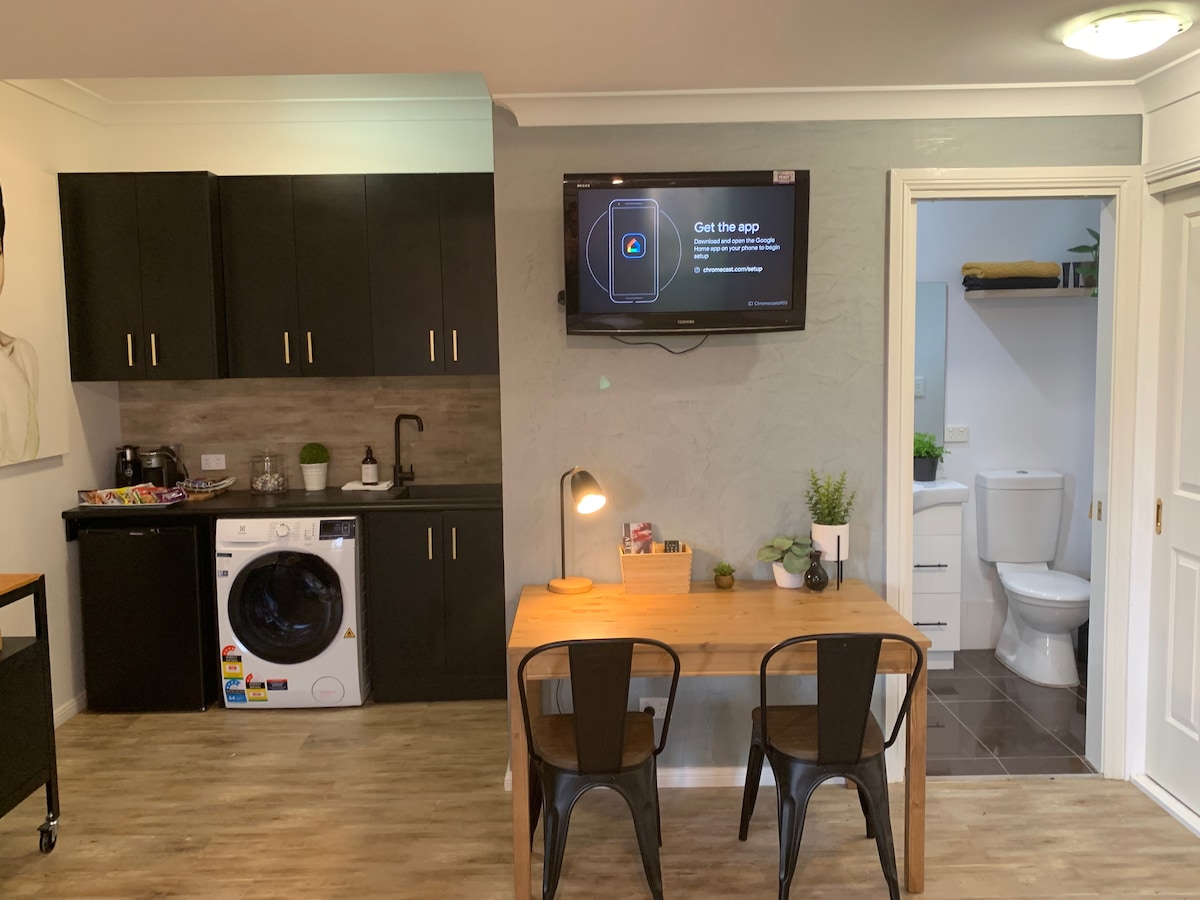 Наш повністю автономний гостьовий будинок-студія розташований недалеко від нашої основної резиденції, на доглянутому помешканні для коней у Мунбі. У 20 хвилинах їзди від серця Тамворта! Насолоджуйтеся видом на гори з веранди, якщо вам пощастить, кенгуру можуть приєднатися до вас. Незалежно від того, чи ви відвідуєте район Тамворт, відвідуєте спортивний захід, AELEC зі своїм конем або просто проїжджаєте через регіон Тамворт/Нова Англія; наш гостьовий будинок тихий, комфортний, спокійний і приватний.