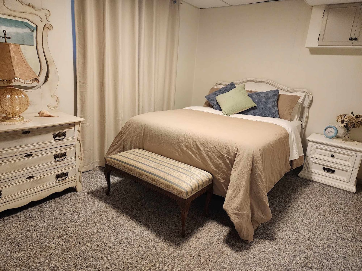 Нещодавно ми відремонтували підвал, щоб створити стильний, сучасний, затишний і тихий гостьовий апартамент. Бічний вхід відкривається безпосередньо на сходи, що веде вас вниз до помешкання. У ньому є замикальні металеві зовнішні двері для звукоізоляції та безпеки. Квартира - це світла квартира-студія з трьома великими вікнами, повноцінною кухнею, зоною відпочинку з телевізором та каміном, обіднім столом, ліжком Queen size, гардеробною та власною ванною кімнатою з п 'ятифутовим душем. Завдяки великій звукоізоляції!