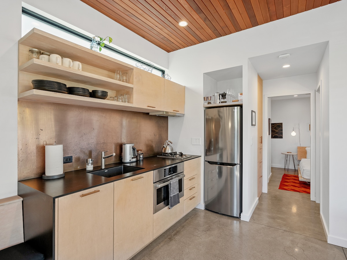 Відкрийте для себе дивний і чудовий південний Портленд із спокійного, нещодавно побудованого помешкання в районі для прогулянок/їзди на велосипеді з ліжком king-size і великою кількістю світла! Прокидайтеся добре відпочиваючим і відкрийте шторку на вікнах від підлоги до стелі до ранкового світла. Насолоджуйтеся повноцінною кухнею та ванною в захоплюючому будинку, спроектованому архітектором, який ідеально підходить для гурманів, пар і віддаленої роботи. Чудове розташування всього в декількох кроках від пекарень, магазинів, парків і тавернів. Відкрийте для себе химерний характер і модну їжу Belmont-Hawthorne-Tabor!