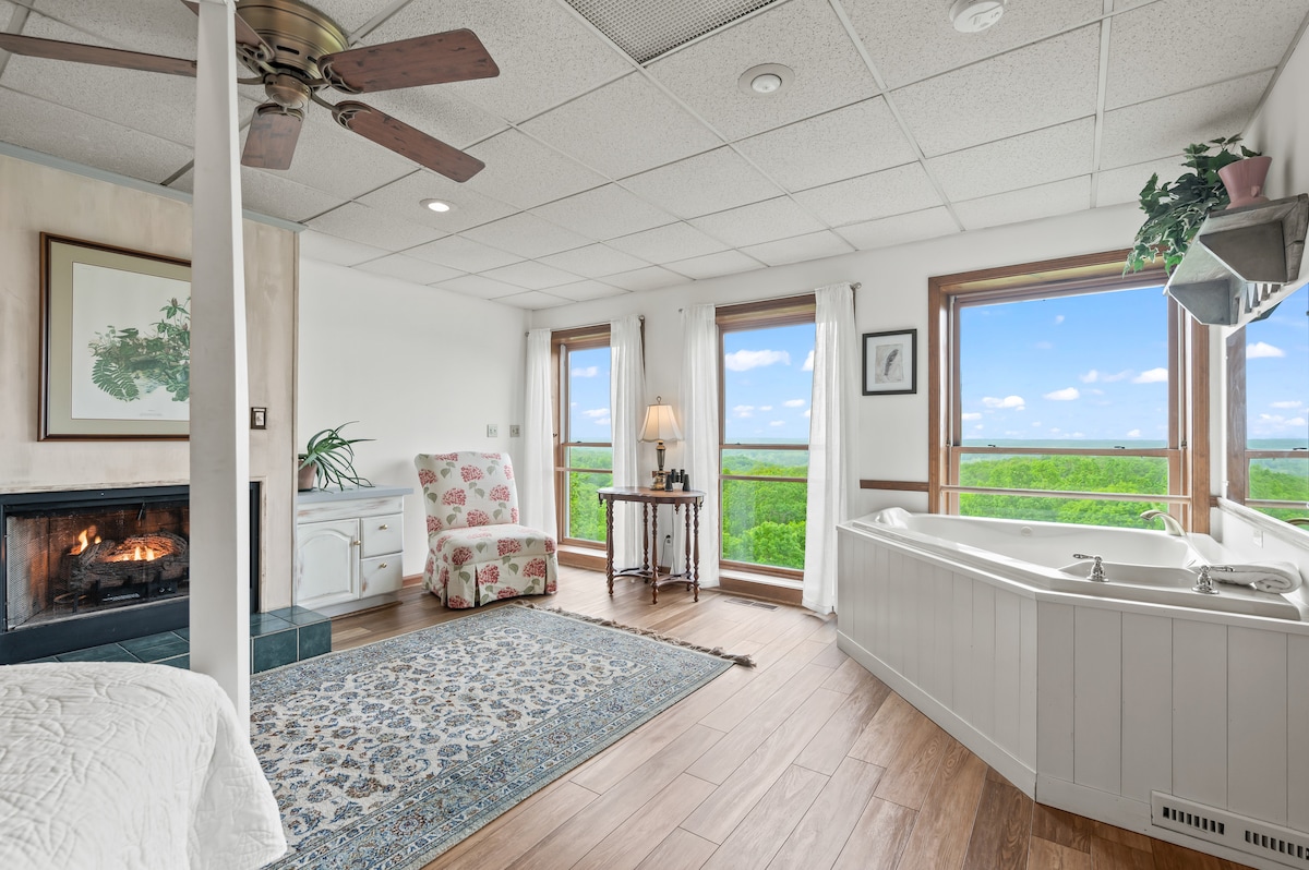Open concept loft with an AMAZING view! Recently featured in Midwest Living's "Best Romantic Getaways in Indiana," The Treetop Suite is set atop one of the highest hills in Brown County; with a jetted spa tub, gas fireplace (seasonal), full kitchen, and king bed, this is the perfect spot to “nest.” Floor to ceiling windows bring nature and the view of forest-clad hills inside. The private deck overlooks one of the best views in the Midwest. This a special and memorable spot!