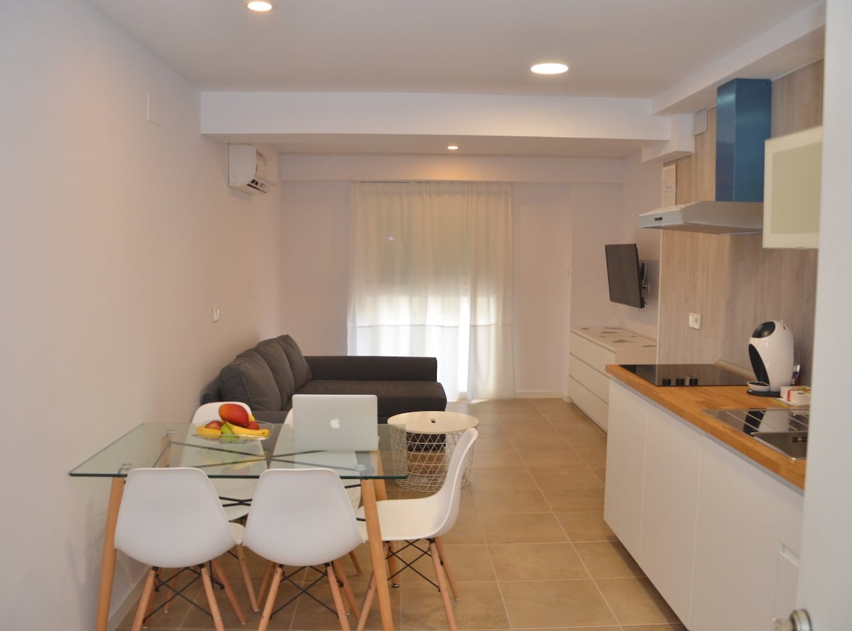 Світла квартира для 4 осіб, з двоспальним ліжком та диваном-ліжком у затишній зоні відпочинку. Кухня обладнана керамічною варильною поверхнею, мікрохвильовою піччю, холодильником і кавоваркою Nespresso. Ванна кімната з феном, рушниками та засобами гігієни. Підраховується за допомогою кондиціонера та високошвидкісного Інтернету. Підніміться на вражаючий внутрішній дворик у тихому районі Валенсії недалеко від моря та Міста мистецтв.