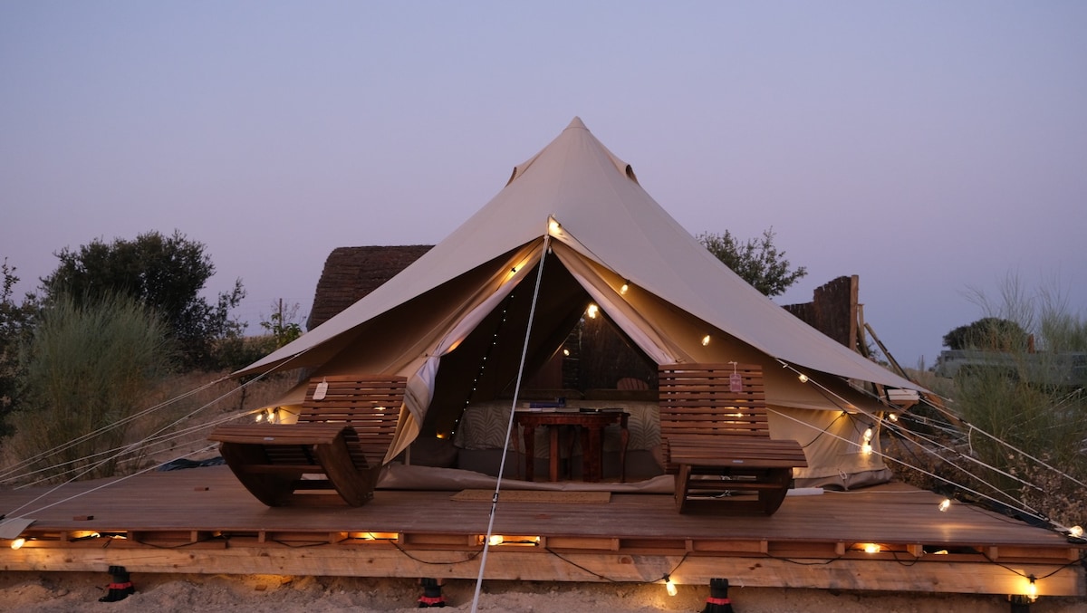 Намет на 2 осіб на просторій ділянці з відкритим видом, поруч із туалетом. Включає 2 ліжка з поролоновими матрацами 190х90, пуфи, 2 стільці, стіл, електрику, холодильник та маленькі лампи. У природі, але всього в 10 хвилинах ходьби від затишного села Орта-де-Сант-Жоан. На пішохідній та велосипедній доріжці Via Verde, де заборонено рух автомобілів, та в природному парку Ельс-Портс. Терасний кемпінг, тому відкритий вид. Тільки для відвідувачів віком від 14 років. Безкоштовне користування гарячою водою, книгами, іграми, басейном, петанком, терасою, барбекю, кухнею на відкритому повітрі та Wi-Fi.