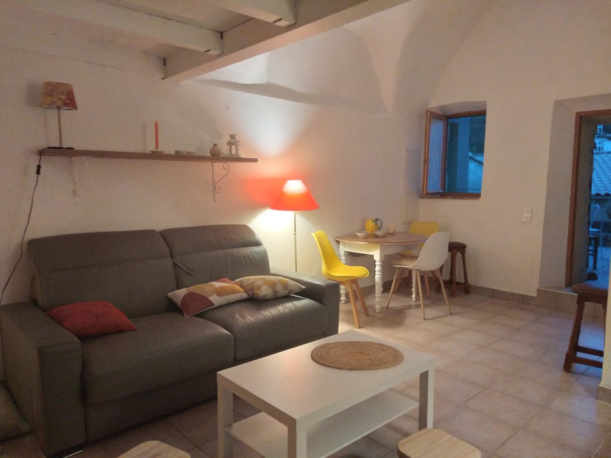 Розташована та прихована в провулку на висотах Корбари, спокійна та солодка сімейна квартира, підтримувана кам'яними, товстими стінами, типовими для корсиканських сіл. 35 м2, які ми відремонтували, поєднуючи комфорт, традиції та чарівність (Wi-Fi) 50 м від панорамного краєвиду La Chapelle des 7 болів. 10 хвилин їзди до пляжів і магазинів Іль-Рус і Альгайоли Ресторани/ринковий садівник/продуктовий магазин у селі (сезон) Продуктовий магазин відкритий цілий рік
