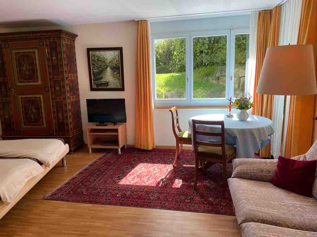 Скандинавський мебльований помешкання зі сніданком у відремонтованому 100-річному колишньому фермерському будинку. У оранжереї та на першому поверсі живуть 3 канікули. У квартирі на першому поверсі є: спальня з видом на гори | Дитяча кімната/бібліотека | Інфрачервона сауна | Їдальня/вітальня зі шведською плитою та диваном-ліжком | кухня | невелика ванна кімната. Висота кімнати у ванній кімнаті, у дитячій кімнаті та в спальні - 1,83 м. Інші кімнати зазвичай високі. PanoramaCard Thunersee (картка гостя) передбачає знижки.