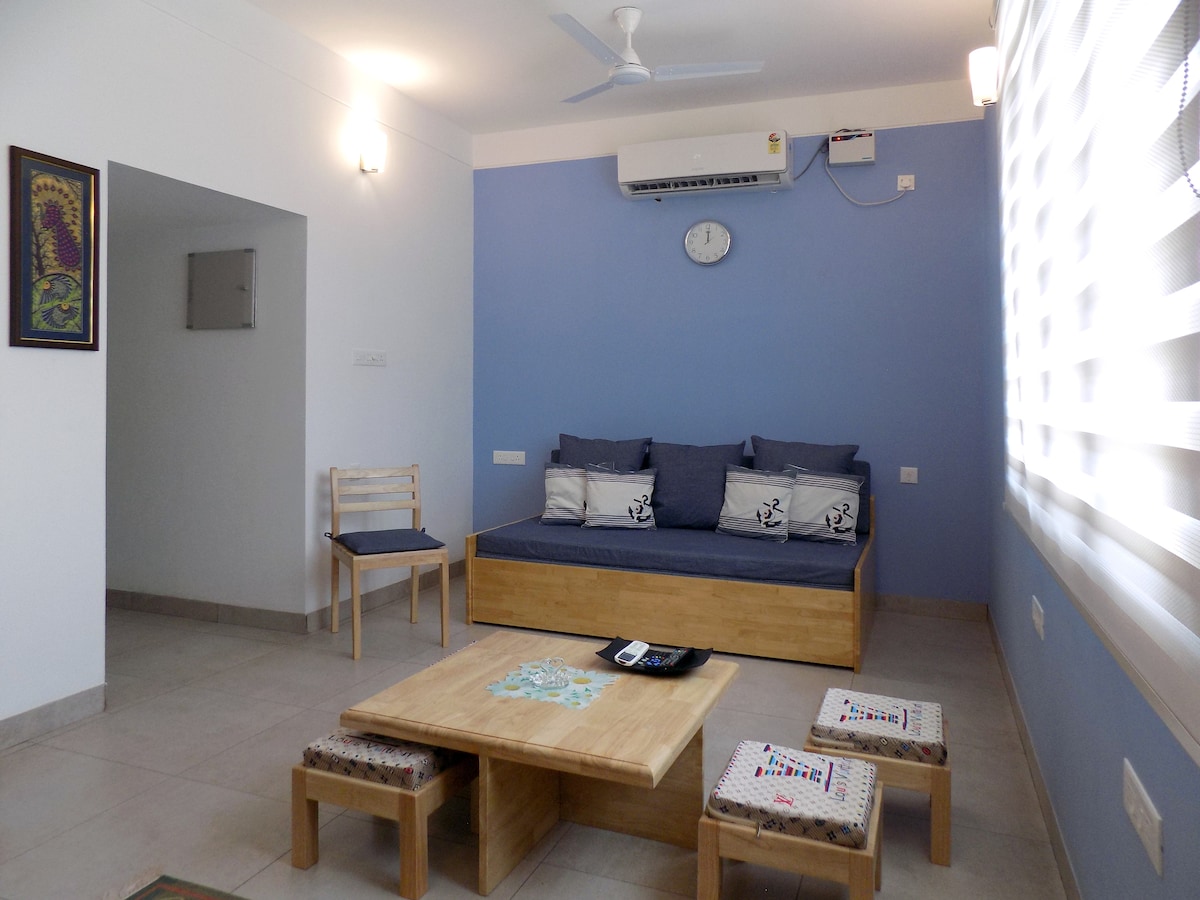 This one Bedroom Apartment at GF with a hall, functional kitchen, and attached bathroom is a fully private space with No sharing of any area. It is at walking distance from Promenade beach, Rock Beach, Ashram, White Town, market & all cafes. The Place is near White Town and still close to nature with very peaceful surroundings. All the windows are facing huge green Ground. It has fully functional kitchen with utensils, Freeze, AC, Geyser, TV, High speed wi-fi. We need id proofs of all guests.