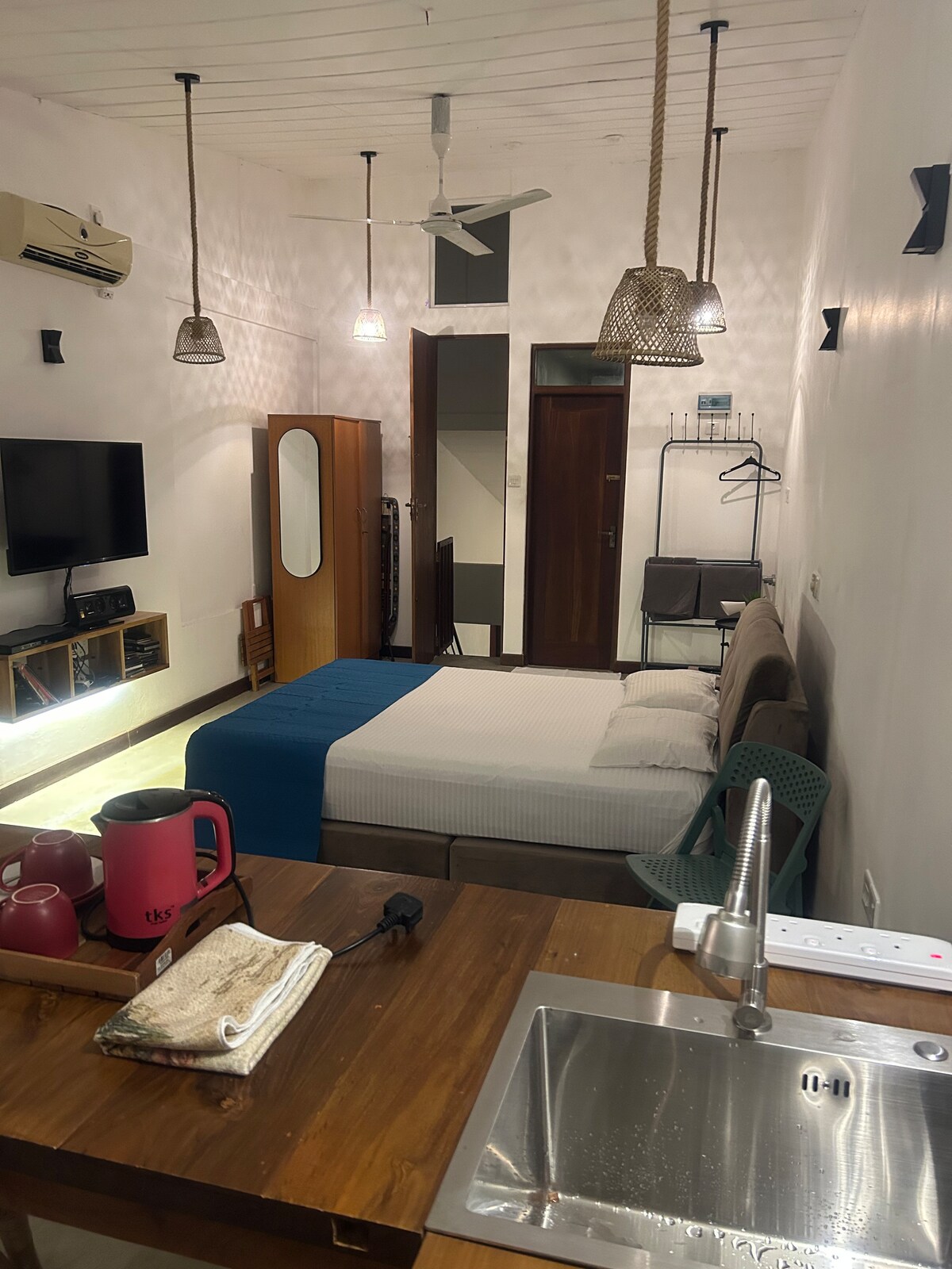 Спокійне розташування SC Galle знаходиться за 3 км від форту Галле з чудовим видом. Лофт площею 70 кв. м має відкриту кухню зі стільницею, ліжком з верхнім матрацом, москітною сіткою, кондиціонером (зазвичай не обов 'язково), вентилятором, диваном тощо. Ванна кімната з ванною простора. 25-метровий басейн і фітнес-зал безкоштовні з 07:00 до 20:00. Ціна дійсна лише для спільного прибуття, макс. 2 особи. Оренда скутера 5 дол. США/день. Власний необмежений WI-FI зі швидкістю від 2 до 8 Мбіт/с. Ідеально підходить для бізнесу/домашнього офісу.