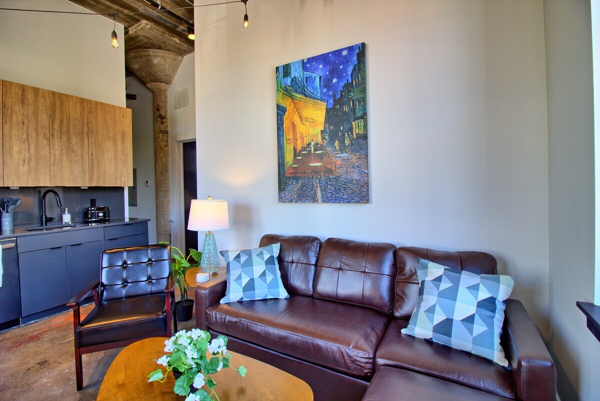 Nash Loft - це приголомшлива мінімалістична квартира з 12-дюймовими стелями, повністю обладнаною кухнею з чорною технікою з нержавіючої техніки та кварцевими стільницями, просторою шафою для входу, складною пральною машиною + сушильною машиною, дизайнерською ванною кімнатою з чорною нержавіючою технікою та скляним душем без рамки, а також яскравими 7-дюймовими промисловими сталевими вікнами з видом на вулицю з деревами та магазини внизу. Розташована вздовж відомої вулиці Локаст у центрі Мідтауна, за кілька кроків від SLU, Wells Fargo, BJC та The Grove.