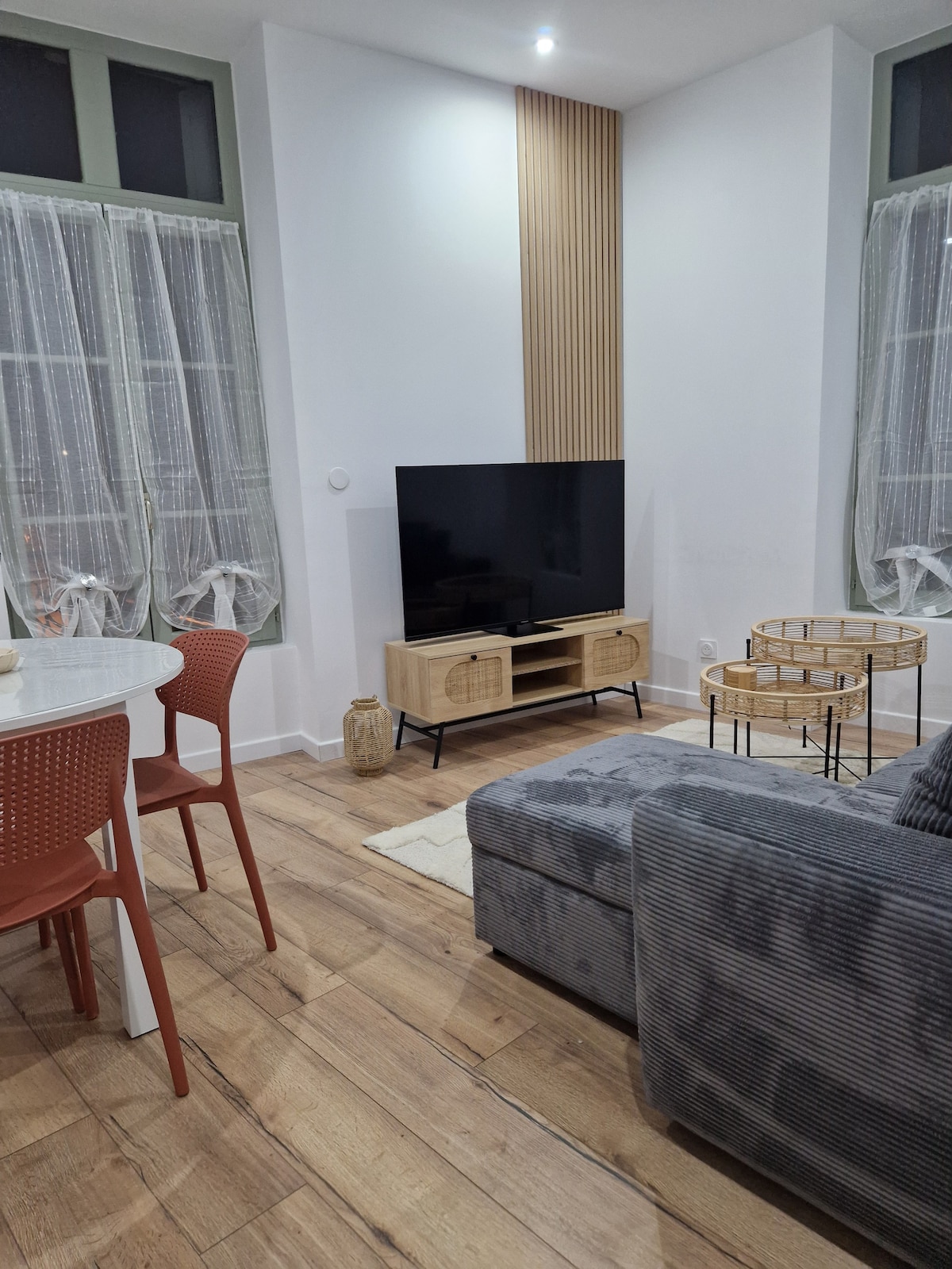 Чарівна 2-кімнатна квартира з балконом. Він дуже добре опалюється (колективно) і ретельно оформлений у стилі кокона, приємний, теплий і зручний. Розташована на 3-му поверсі з ліфтом у гіперцентрі (80 м від Отель-де-Віль). Оснащена Smart TV Box. Привітне привітання. Поруч з усіма зручностями, барами, ресторанами, магазинами, кінотеатром і музеєм. Трамвайна та автобусна зупинка за 80 м, залізничний вокзал за 15 хвилин пішки. Гараж відповідно до вільних дат, який буде підтверджено в бронюванні.