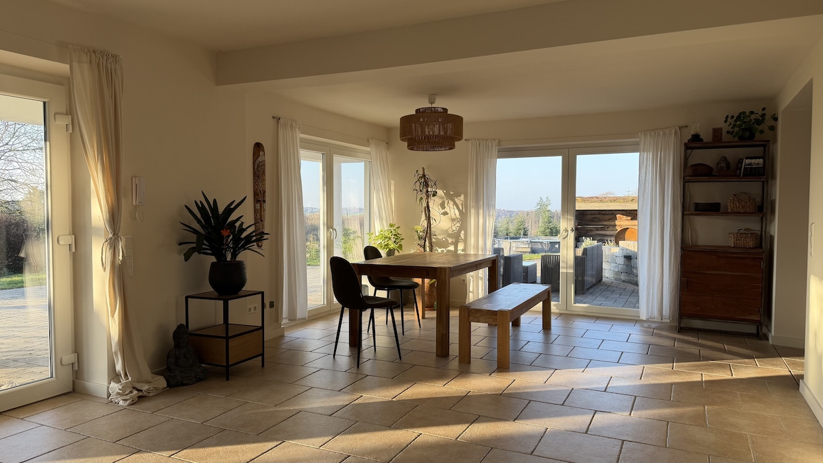 Ідеальне розташування для відвідувачів ярмарку Найкраще помешкання для сімейного відпочинку приблизно 130 кв. м житлового простору на 2 рівнях Велика тераса з видом на сад/ліс і приватний ліс. Фітнес-зал на 6 осіб, фінська, 6 осіб (за додаткову плату) Професійна кухня з обіднім столом на 6 осіб та телевізором Офіційна їдальня з обіднім столом на 6 осіб Велика кімната з двома двоспальними ліжками та окремою ванною кімнатою на 1-му поверсі Головна спальня та друга спальня на першому поверсі з ванною кімнатою Пристрої смарт-телевізора у всіх спальнях і кухні