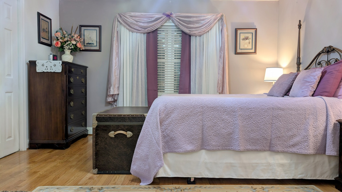 Наші тепло оформлені гостьові апартаменти прикріплені, але повністю відокремлені від основної частини нашого помешкання, з окремим входом. У люксі є простора спальня, велика ванна кімната та окрема вітальня/спальна зона з телевізором, міні-холодильником/морозильною камерою, мікрохвильовою піччю та Keurig. Суміжна пральня доступна для використання за запитом (FOC). Невелика тераса, патіо та повністю огороджений двір включені в ексклюзивне користування. Парковка доступна на вулиці прямо перед нашим помешканням.
