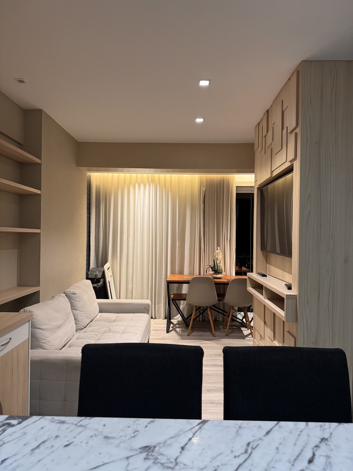 AP 1/4 сучасний, затишний, у безпечному місці недалеко від супермаркету, торгового центру, барів/ресторанів, пам 'яток високий поверх, з краєвидом, будівля з 2 басейнами, тренажерний зал, гідроенергія, сауна ВКЛЮЧЕНО - Постільна білизна та рушники - 1 паркувальне місце - Повністю обладнана кухня. - Посудомийна машина - пральна та сушильна машини; - Смарт-телевізор 65" c/ Netflix - Wi-Fi. Alexa (домашня автоматизація) – кавоварка Oster Primalatte; - Електричне барбекю. - Друга в спальні та вітальні. - Ferro de Passar - Secador