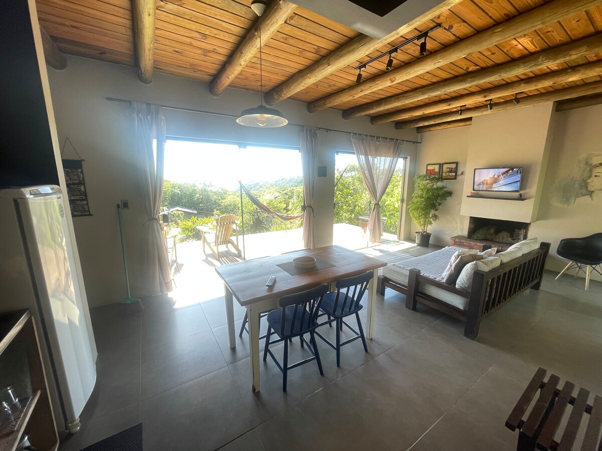 Ласкаво просимо до притулку Shadow Bananeira (@sombradebananeira). Ми пропонуємо помешкання в дуже добре спроектованому та обладнаному хаті з повноцінною кухнею, обігрівачем і гідромасажною ванною поруч із кімнатою, розташованою в антресолі, а також чарівну прибудинкову територію з вогнем на грилі. З усіх приміщень притулку відкривається неймовірний вид на північне узбережжя Ріо-Гранді-ду-Сул.